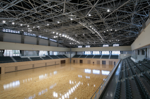 - 草津市の野村公園内にあるYMITアリーナ(くさつシティアリーナ)に、放水型ヘッド等スプリンクラー設備を納入、施工しました。アリーナの高天井部分にはスプリンクラーヘッドが設置されておりますので、有効にかつ的確に自動放水をすることができます。
